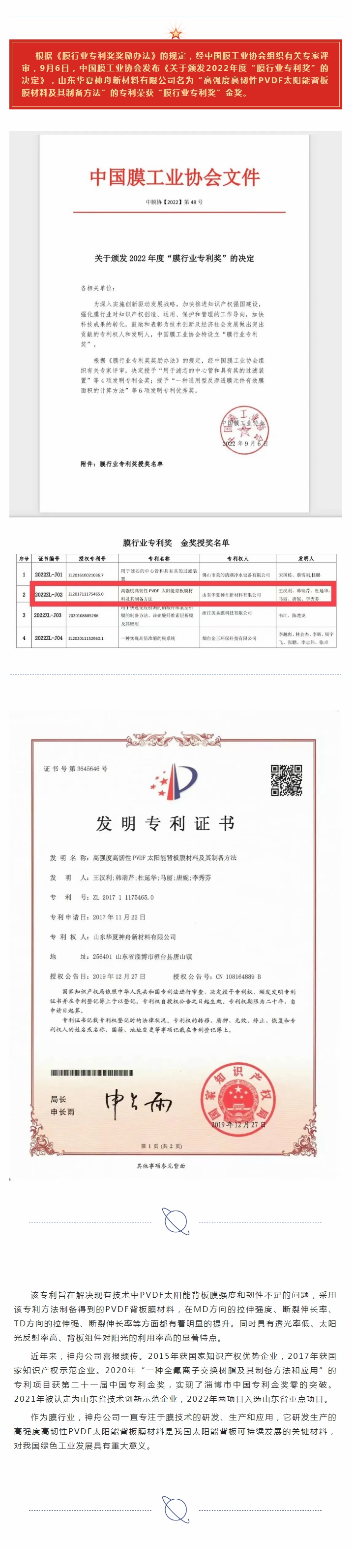 神舟公司榮獲中國(guó)膜行業(yè)專(zhuān)利金獎(jiǎng)